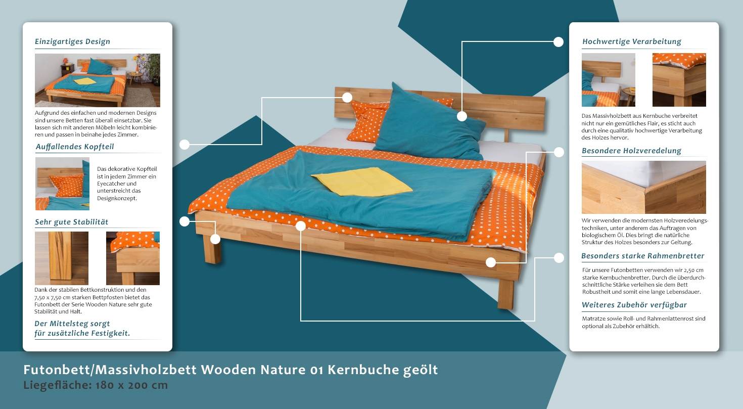 Nos lits convainquent non seulement par leur design moderne, mais aussi par la haute qualité du bois de hêtre massif et par la qualité de l'artisanat. Nous utilisons les techniques de finition de bois les plus modernes et l'huile biologique fait ressortir la structure naturelle du bois.